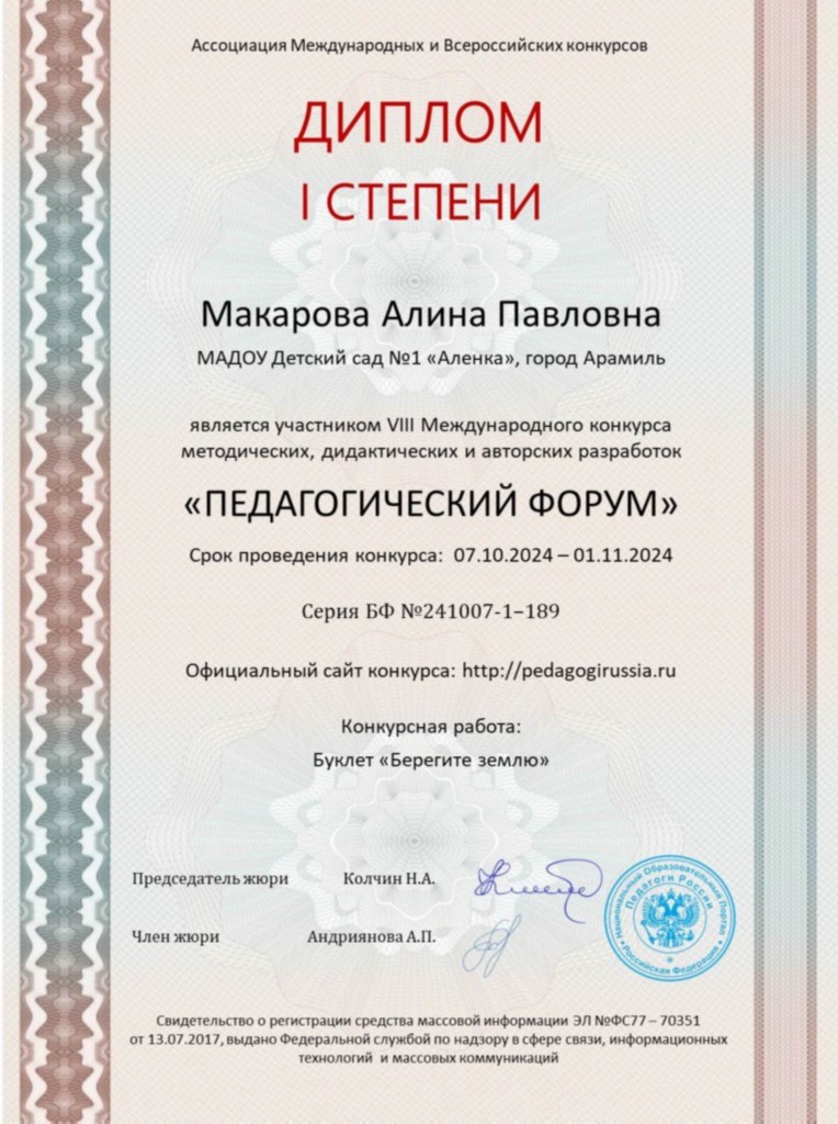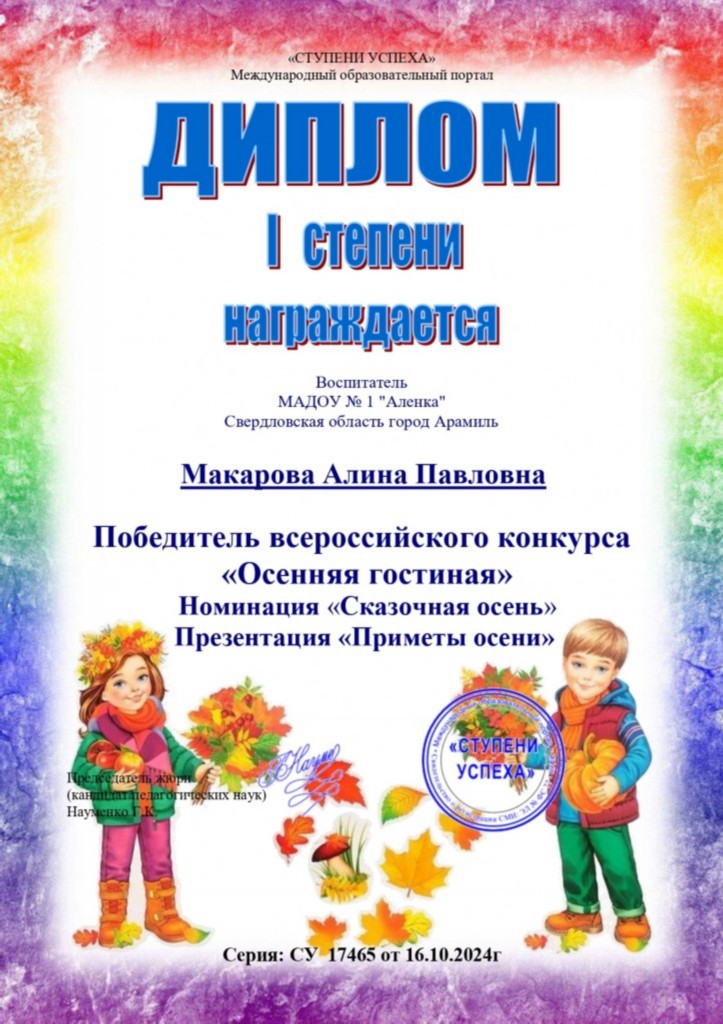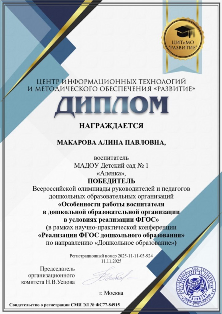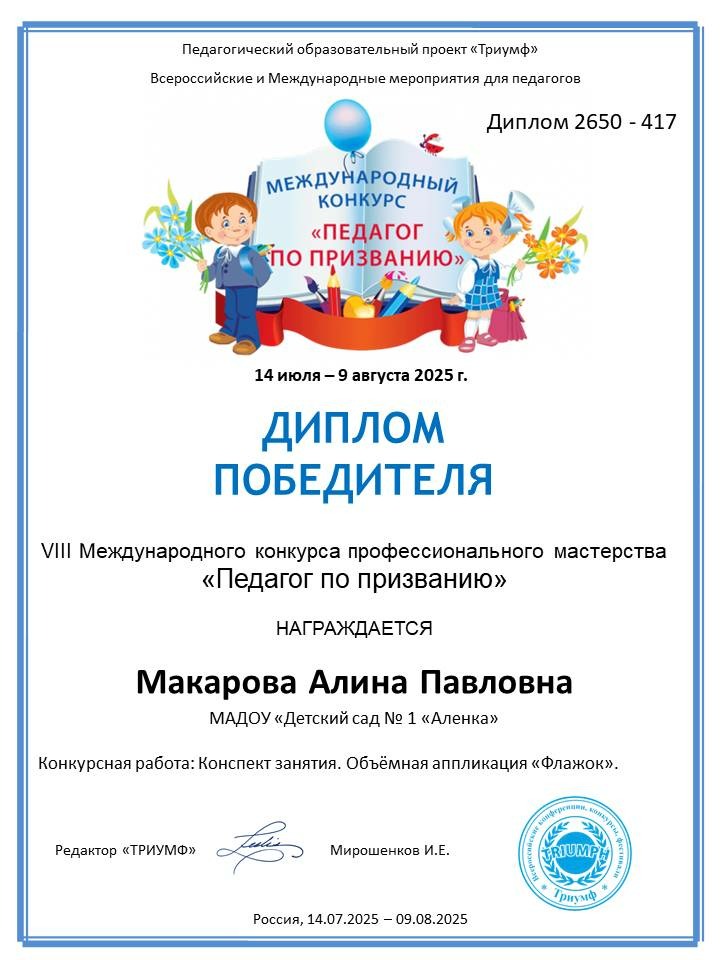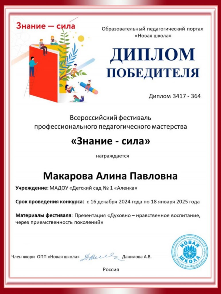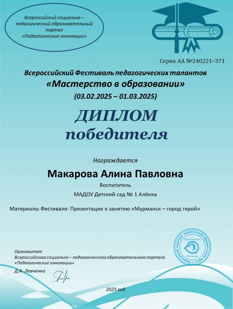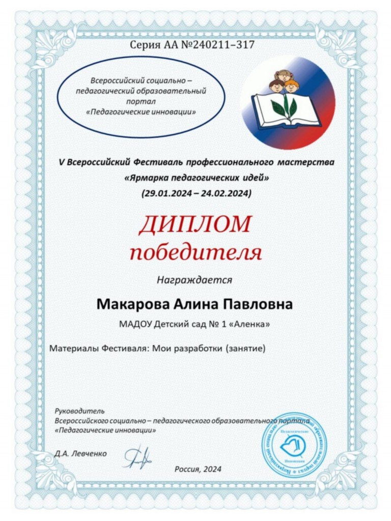 Диплом победителя за Всероссийский Фестиваль педагогических талантов