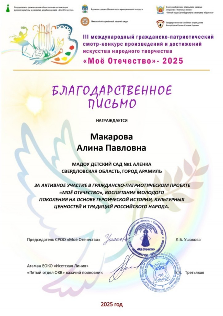 Благодарственное письмо за подготовку победителя III международного гражданско - патриотического смотра - конкурса "Мое отечество"