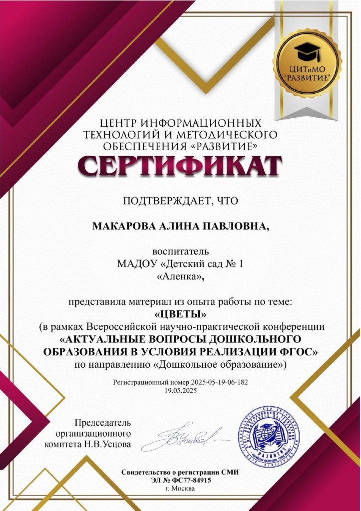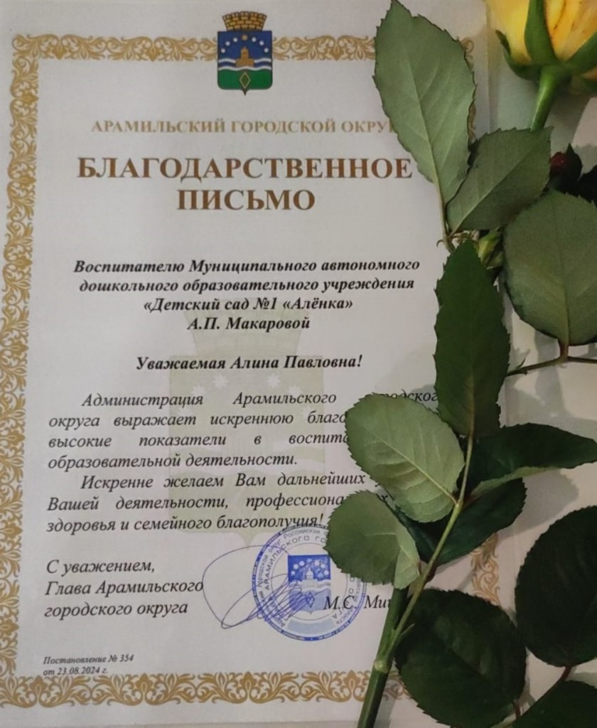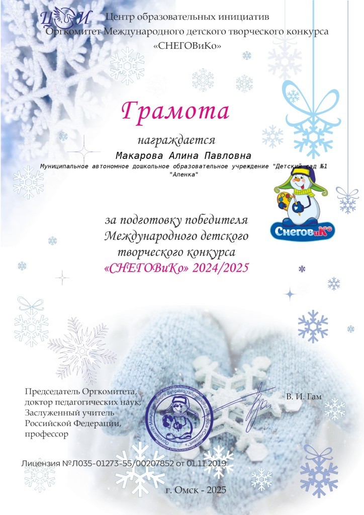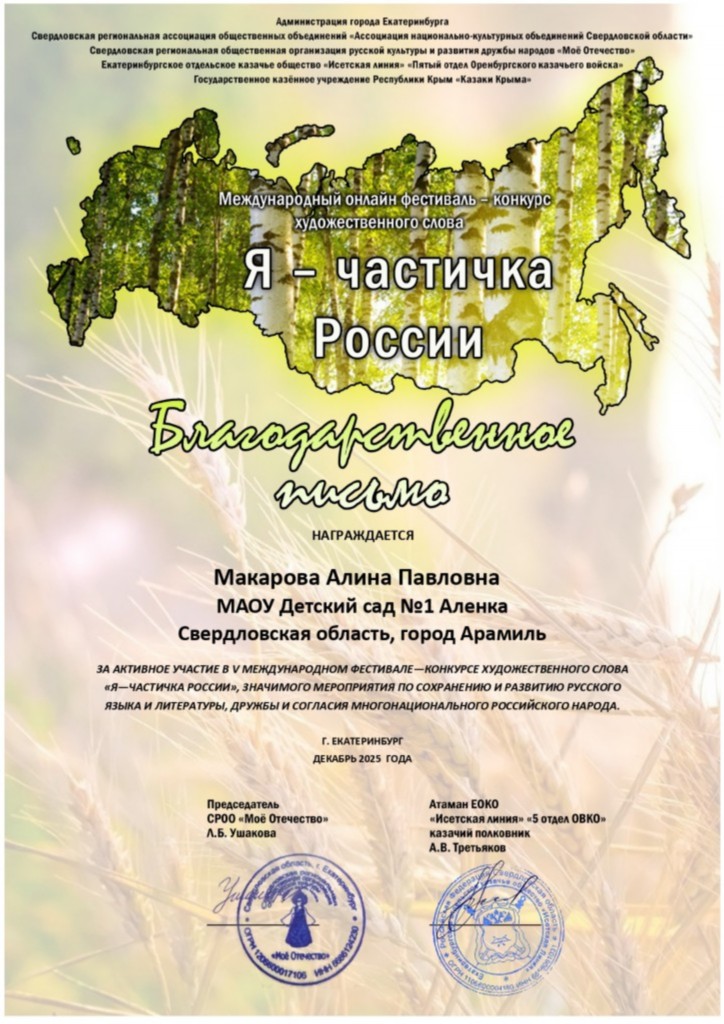Благодарственное письмо за подготовку победителя в Международный онлайн фестиваль - конкурс "Я - частичка России"